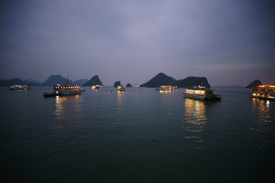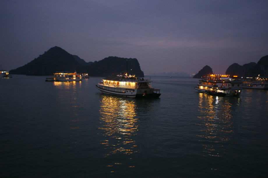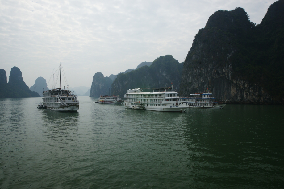 | ハロン湾 | プーケットからバンコクに戻り大きな荷物を空港で預け午後の便でハノイへ、空港から乗合タクシーでホテルへ 翌朝ギャラクシークルーズの送迎のマイクロバスで港に向かう、途中1回凄く大きな売店と土産物屋 (絵画とか彫刻など大量に制作していて工場の様)に寄り12時頃港に到着し乗船 |