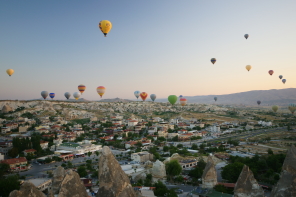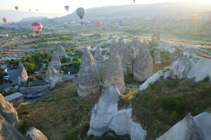 | 地上から気球 | 翌日は早起きして下から気球見学、ギョレメの中心部のからすぐの所に小高い丘があり気球見学ができる。 | ||