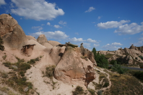 | 道が無い | 頂上の砦より下の方に下って行きバスに乗れる所を探すか、見付らなければ最悪ギョレメ迄は下り坂なので 徒歩でも1時間強で景色を見ながら帰ろうとし、下の方に向って歩いて行くと次第に道が無くなり畑を横切り 坂を下りボルダリングのように壁をよじ登り穴の中を通り、もう引き返すととは不可能と思いどんどん突き進む。 |