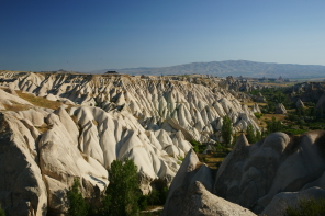 予約したホテルから予約後すぐにバルーン、レッドツアー、グリーンツアー、ジープサファリ、空港送迎の案内の メールが来ていたので、カイセリ空港からホテルまでの迎を予約済 €8。10数人くらいの乗合せでホテルへ。 カイセリ空港からカッパドキア迄の道のりで車窓からの眺めは過去良く行った美瑛の様な感じの木が多くあった。 |
