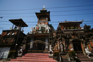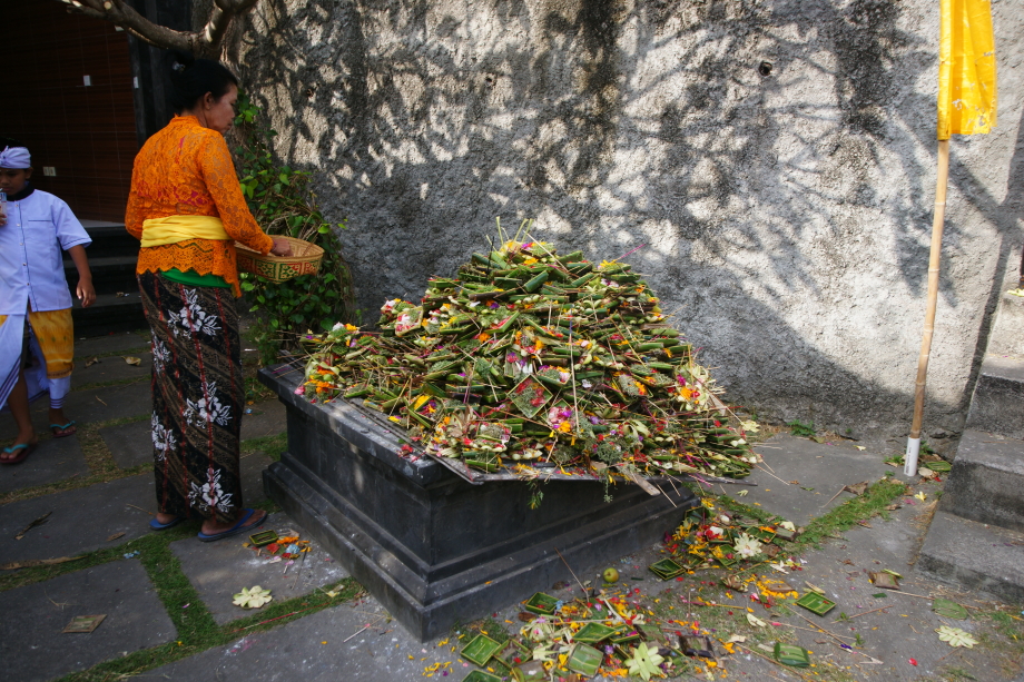 | 御祭り | 1日目のダイビングを午後2時頃終え、街の中心部に歩いていくと頭の上に荷物を載せバリ風の衣装を着た 大勢の人とすれ違う、皆お寺の方に向かっていた。麓のお寺も大勢の人がいたが皆が階段で高い方の寺院に 登って行くので行ってみる事にする。お寺の中に入るには麓の入り口付近で布を借り(無料)腰に巻く。 |