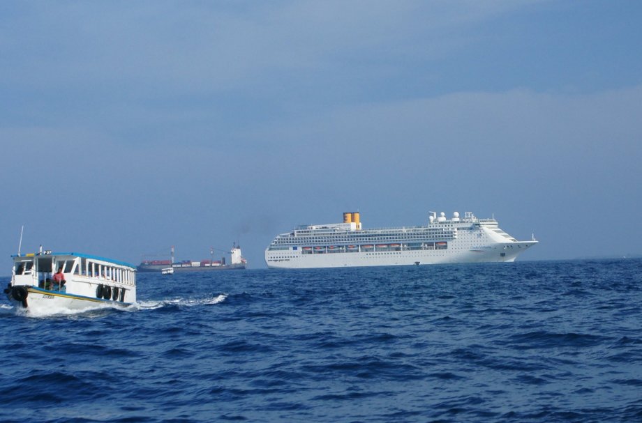 | マーレ付近にコスタ・ヴィクトリアが停泊中、空港隣に大きなコスタの専用ターミナル有。今回は今までよく見た赤と黄色の 水上飛行機を見かけず見たのは殆んど白っぽい物で空港内にトランス・モルディヴィアンと言う会社が有り其れに代った様。 |