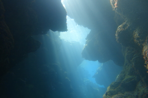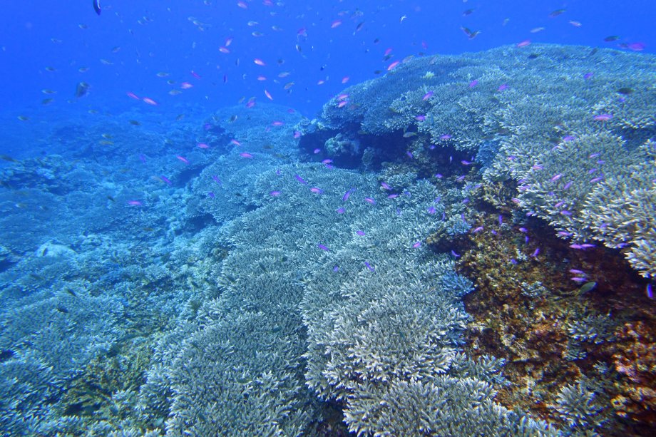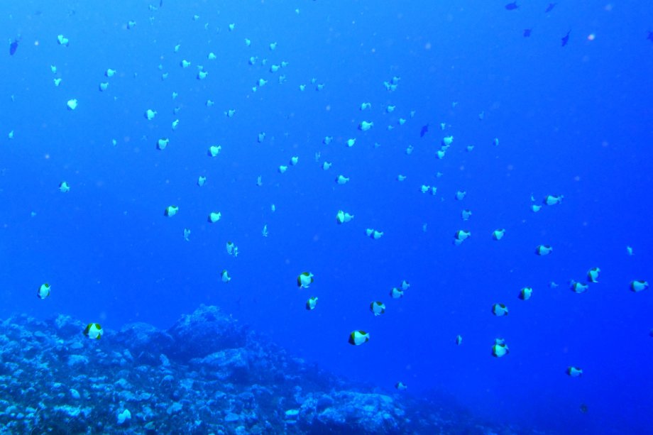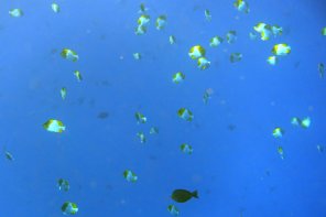 | カスミチョウチョウウオが多く群れていた、2本目先回の伊是名島と同じ太陽光がゆらゆら幻想的、静止画なので判り辛い |