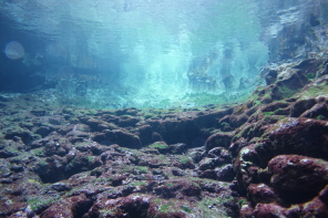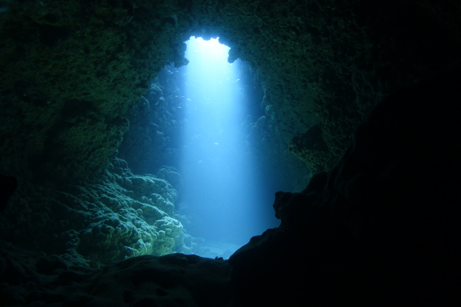 | 伊良部島は地形ポイントが多いが、後から来たダイバーの吐く泡が岩の隙間から綺麗に出てきて他では見られない光景。 |